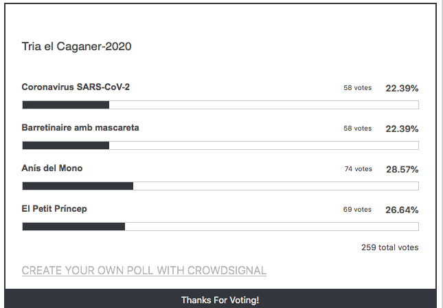 L’administració del blog admet que la duplicitat temàtica entre el Caganer Coronavirus SARS-CoV-2 i el Caganer Barretinaire amb mascareta pot haver causat penalització entre ambdós, és a dir, que possiblement l’un ha restat vots a l’altre i viceversa, la qual cosa de ben segur deu haver beneficiat la resta de figures en competició.